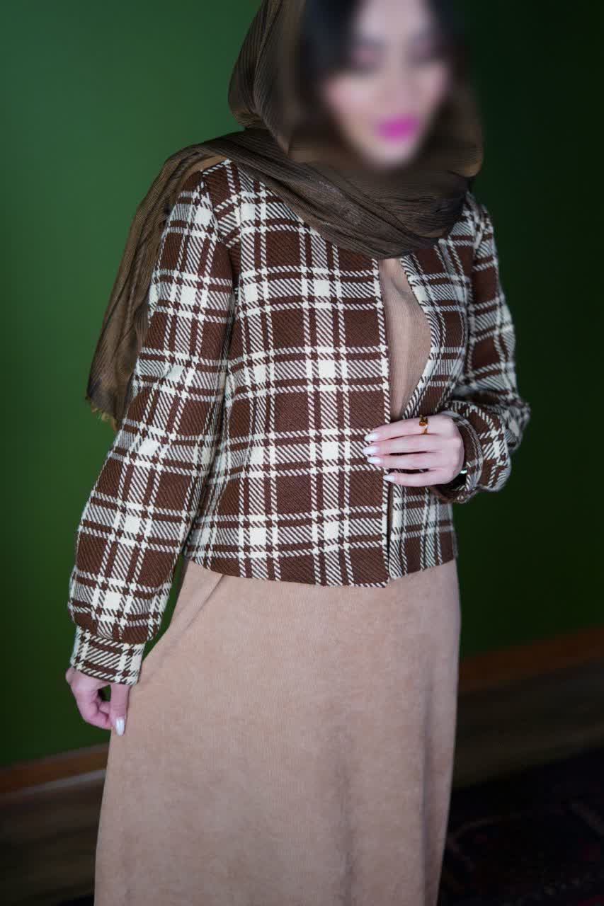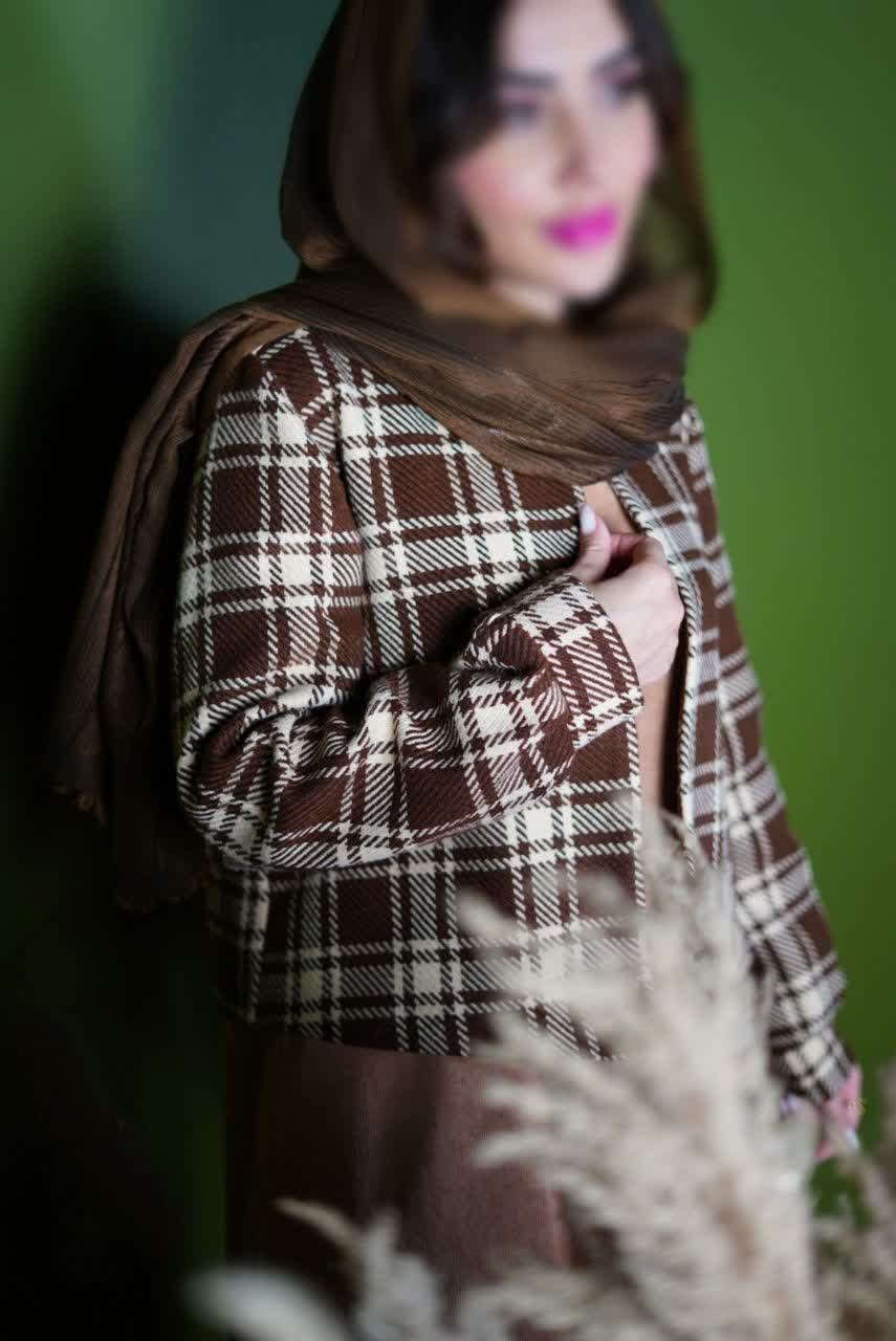 کت از پشمی اعلا با طرح چهارخانهی کلاسیک دوخته شده که ایستایی بسیار خوبی روی بدن دارد و حس شیکپوشی را بهخوبی منتقل میکند. یقه و نوار جلوی کت با پارچهی سادهی هماهنگ طراحی شده تا ظاهری منسجم و مرتب ایجاد کند. قد کت ۵۵ سانتیمتر، تناسب فوقالعادهای با مدل سارافون ایجاد کرده و استایل را خوشفرمتر نشان میدهد.