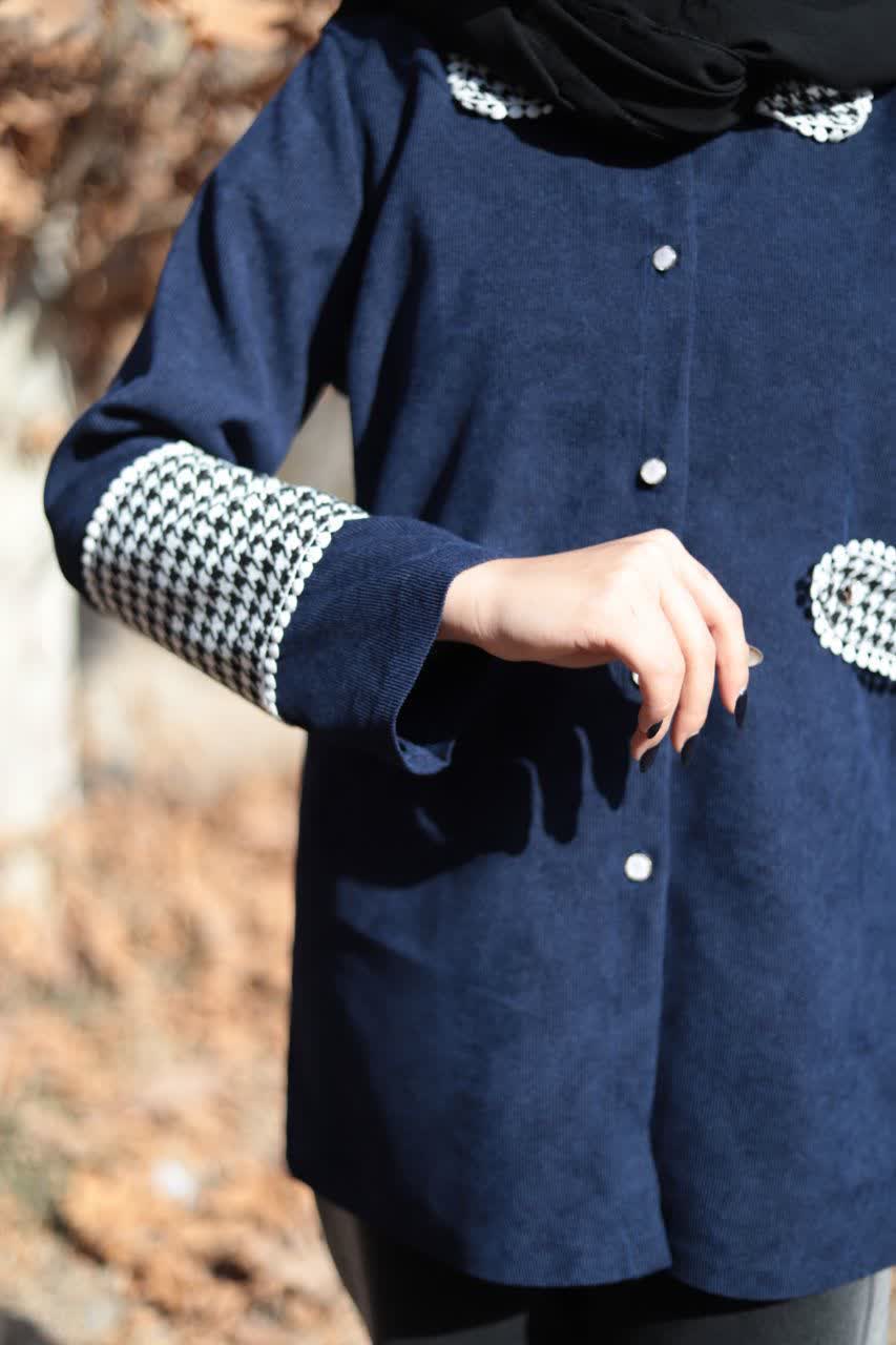 جزئیات پیچازی در قسمت یقه، سرآستینها و جیبها جلوهای خاص و متعادل به مانتو بخشیده و تضادی دلنشین با رنگ سرمهای ایجاد کرده است. طراحی جلو دکمهدار، علاوهبر راحتی، امکان استفاده در استایلهای مختلف را فراهم میکند.